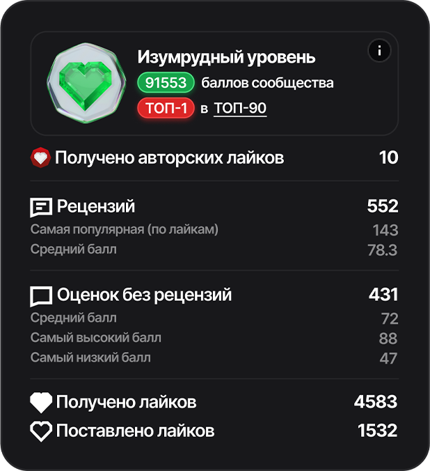 - Формула начисления баллов: авторские лайки (500), рецензии (100), оценки без рецензии (25), лайки на рецензию (3) и лайки другим (1)