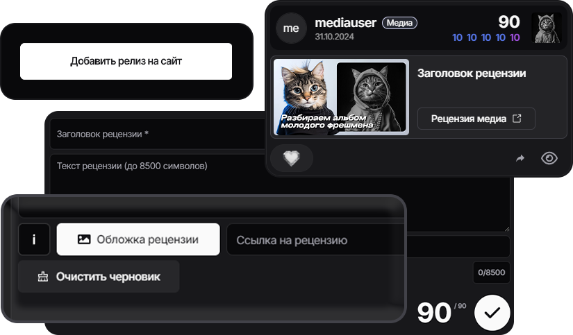 - Медиа имеет возможность добавлять на сайт до 5 релизов (треки или альбомы) в месяц через специальную форму с предмодерацией