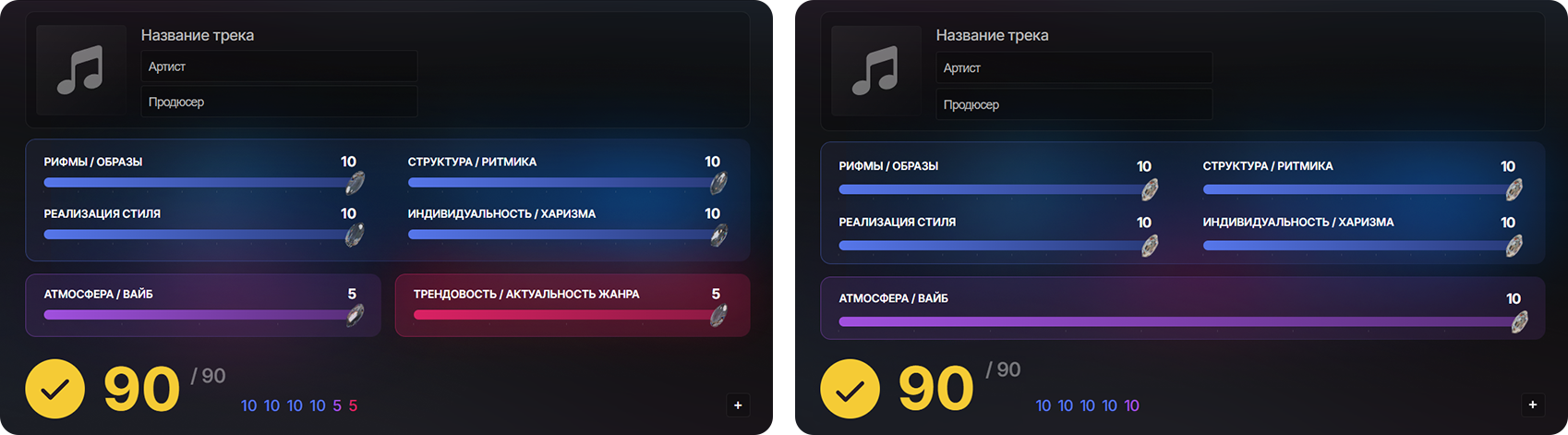 За 3 года существования 90-балльная система оценивания релизов показала свою высокую эффективность, однако мы пришли к тому, что оценки качества работы недостаточно. Творчество – это нечто большее, чем просто качество реализации. Оно наполнено искрой, жизнью, личностью и влиянием артиста. Поэтому мы создали и внедрили уникальную 30-балльную шкалу из трёх базовых критериев и двух множителей, где попытались объять ключевые аспекты, определяющие ценность релиза в музыкальной индустрии.