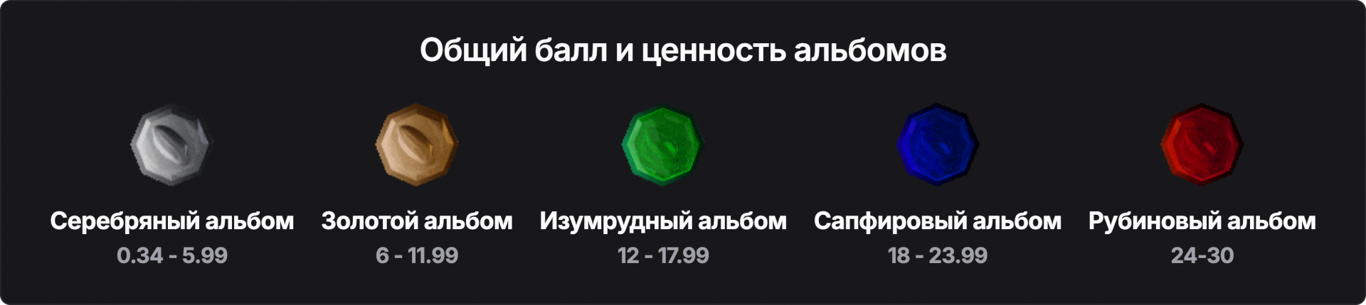 проведения ежемесячных и ежегодных номинаций. В качестве исключения, на основании коллективного решения нашего сообщества, может быть присвоена ценность избранным релизам, на момент разбора которых «Шкала ценности альбомов» еще не была внедрена. После присвоения ценности, на обложке разбора альбома на YouTube и на сайте появляется соответствующий драгоценный камень.