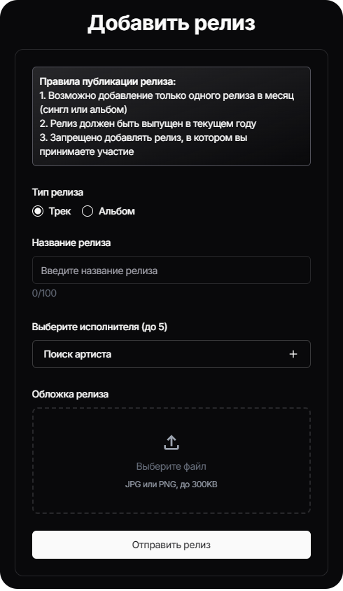 Внедрили форму добавления релиза на сайт с правилами публикации