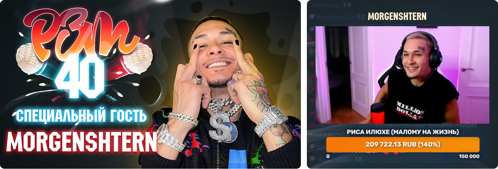 - По просьбе MORGENSHTERN* на трансляции выпуска РЗТ-40 зрители донатили не самому гостю, а мальчику по имени Илья, которому Алишер активно помогал со сбором средств на дорогостоящую операцию. По заключению эфира нам удалось собрать 420 000 ₽, из которых 209 722 ₽ от зрителей трансляции, а вторая половина от ведущего – Александра Фломастера