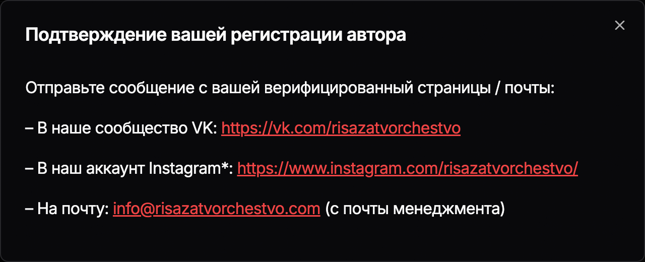 Отправить сообщение об ошибке или задать вопрос, касаемо регистрации автора, функционала или оформления, можно, написав на почту — support@risazatvorchestvo.com
