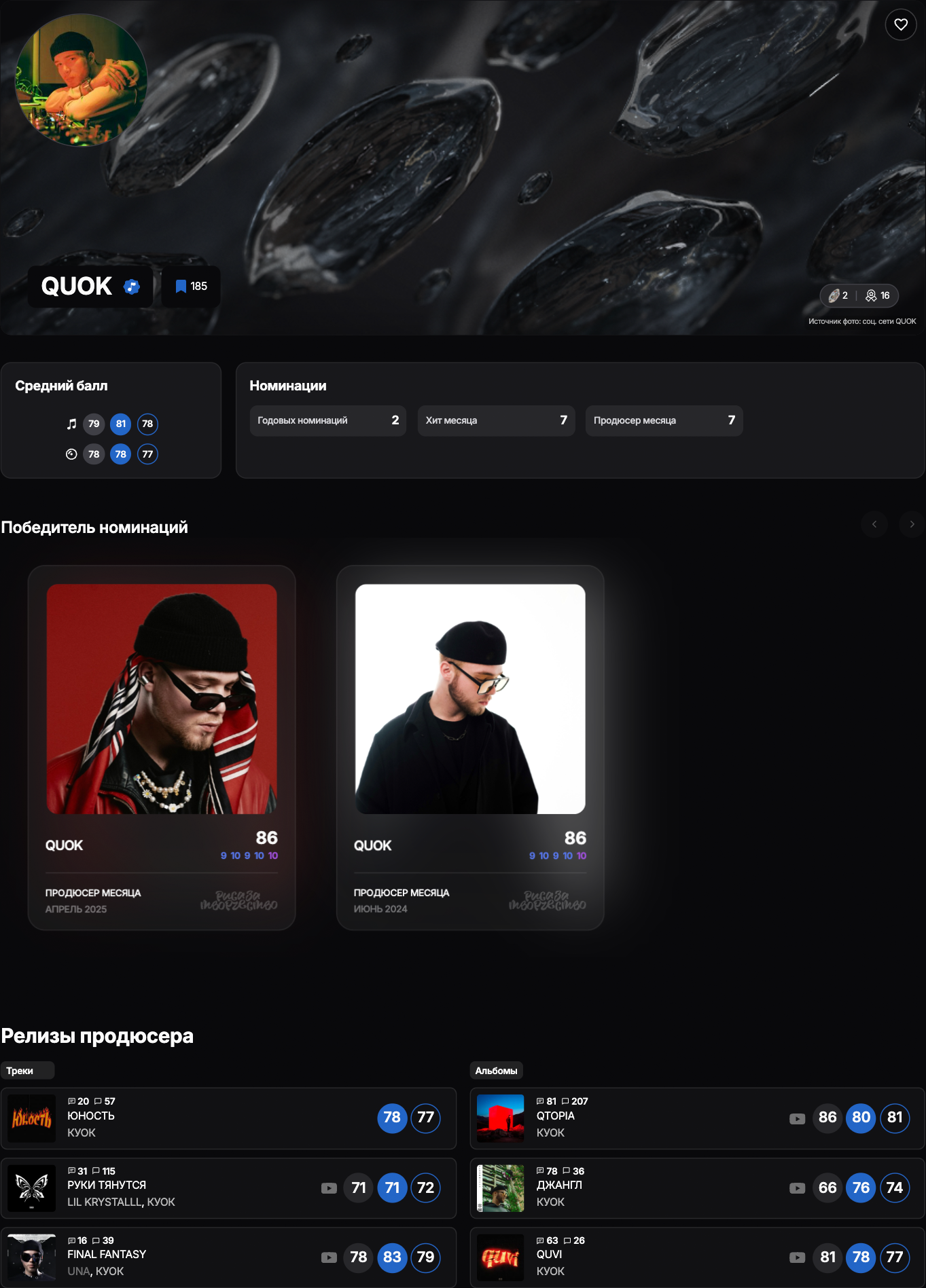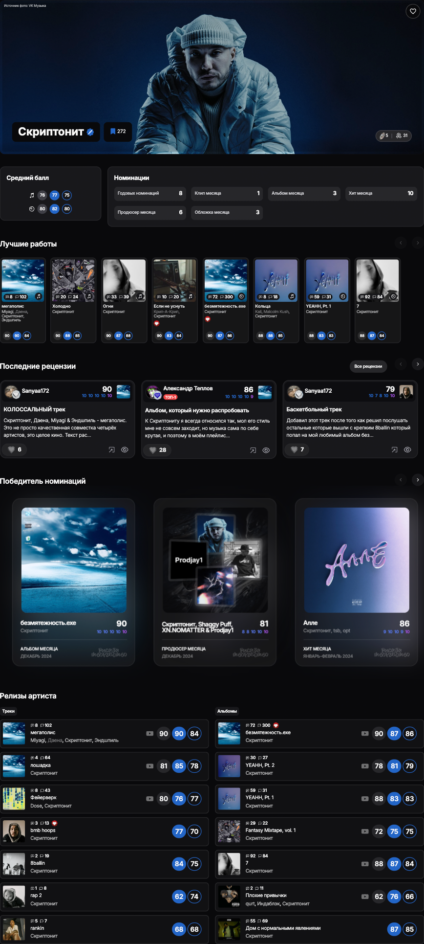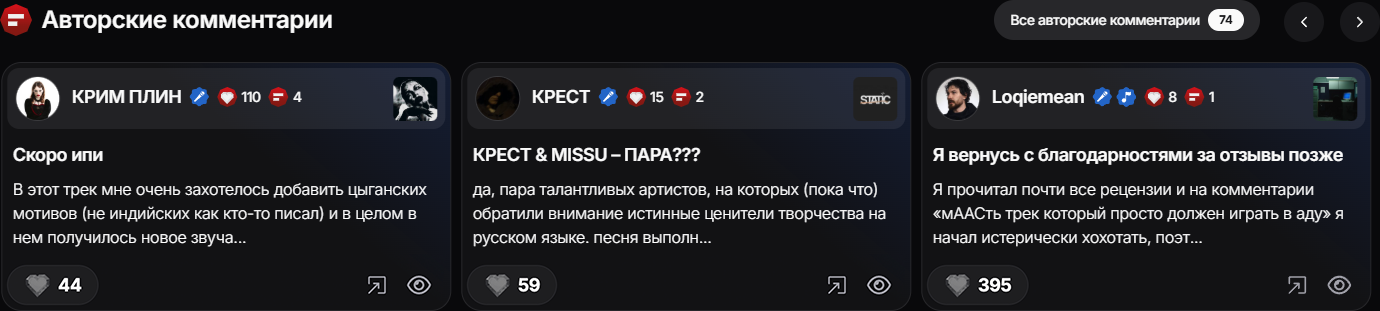 Релизы автора, которые он прокомментировал, либо оставил авторские лайки на рецензии пользователей, помечаются иконками «Авторского комментария» и «Авторского лайка» — соответствующие иконки отображаются в сторис «ТОП-15», в рейтинге, в карточке автора и в общем списке релизов на сайте