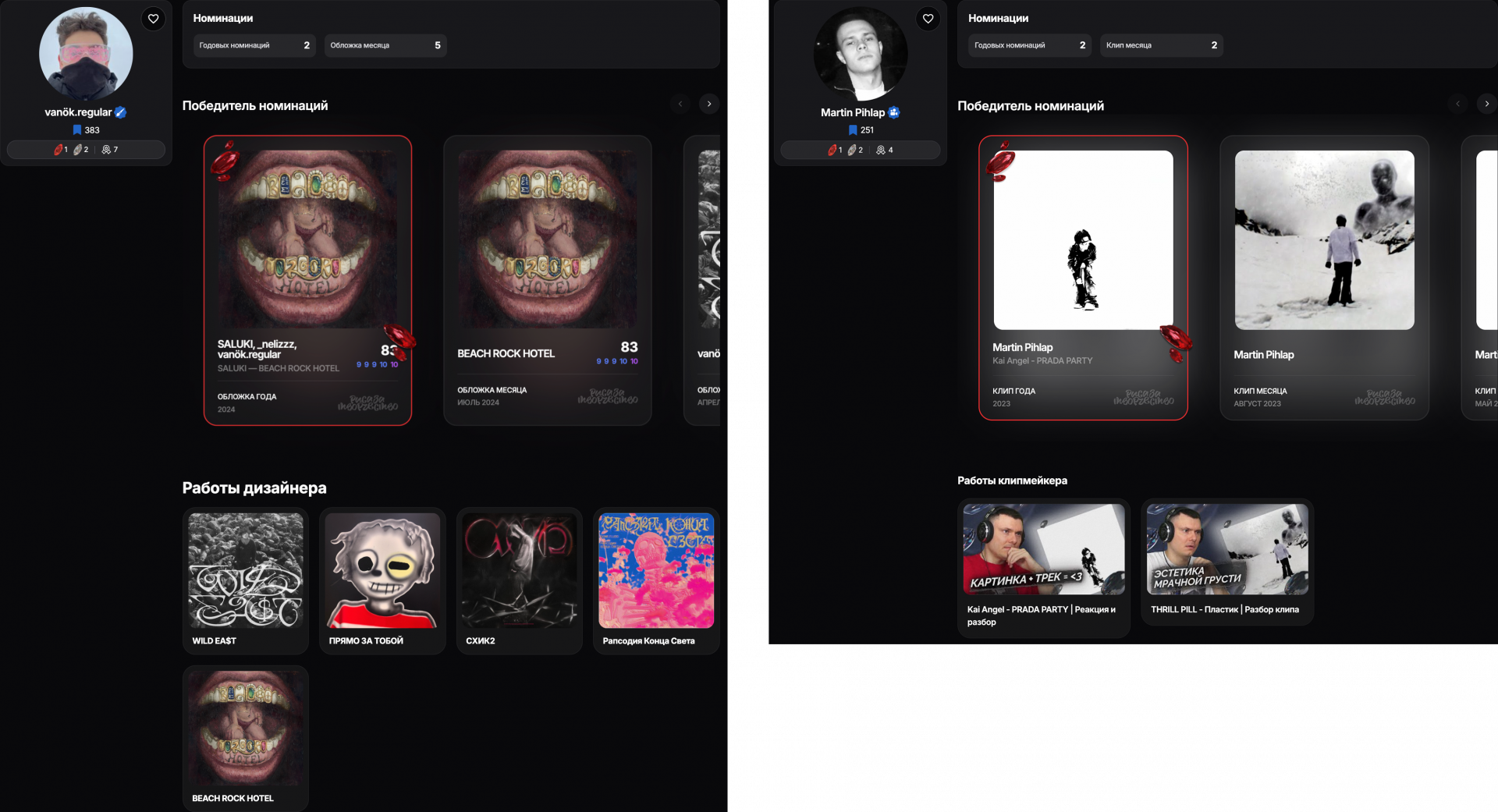В карточке авторов «Дизайнер» и «Клипмейкер» указана категория, аватар, количество добавлений в предпочтения и количество номинаций с номинируемыми работами за всё время
