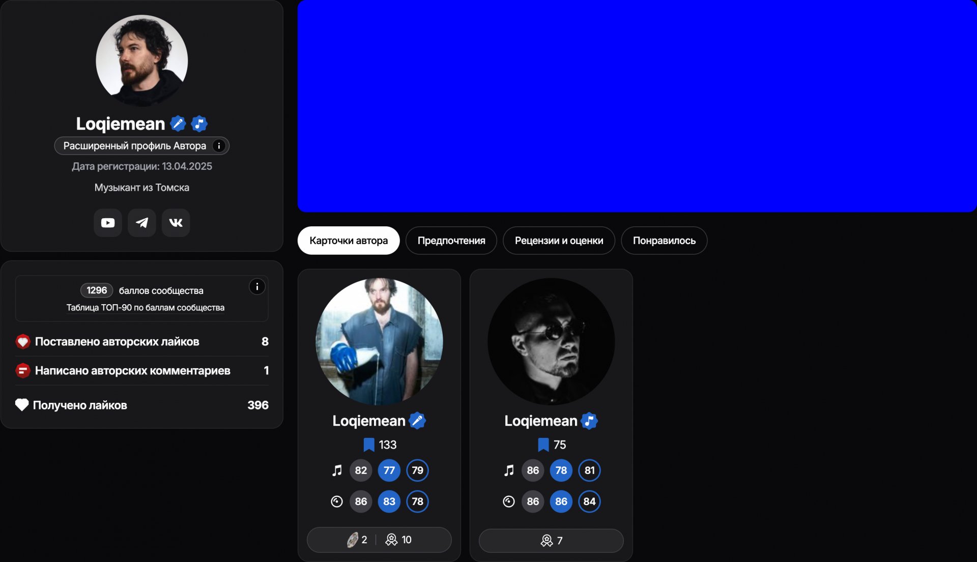 В профиле автора, помимо аватара и шапки, находятся все карточки автора на сайте, никнейм, дата регистрации, описание, прикрепленные социальные сети, общая статистика активности, предпочтения, рецензии и лайки