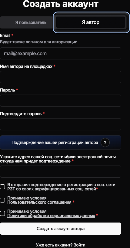 Для регистрации вы должны заполнить данные в полях ввода, ознакомиться с пользовательским соглашением и политикой обработки персональных данных, указать верифицированную страницу в социальной сети или указанную в социальных сетях автора почту, с которой вы отправите сообщение о подтверждении регистрации на сайте