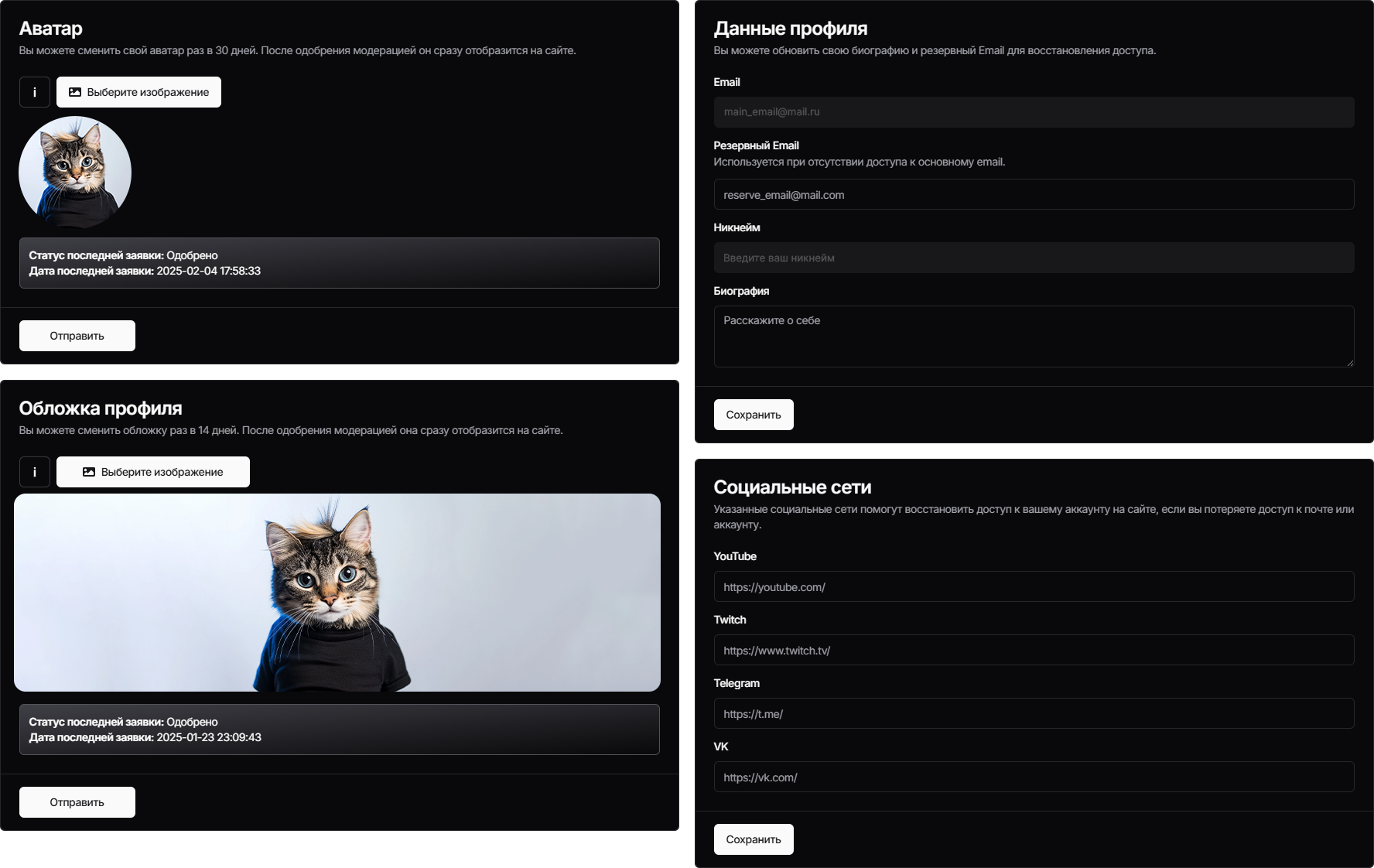 После регистрации на сайте иконка категории в профиле и карточке автора становится синей, автор может добавить аватар и обложку профиля, заполнить описание, добавить резервный адрес электронной почты и прикрепить ссылки на свои социальные сети