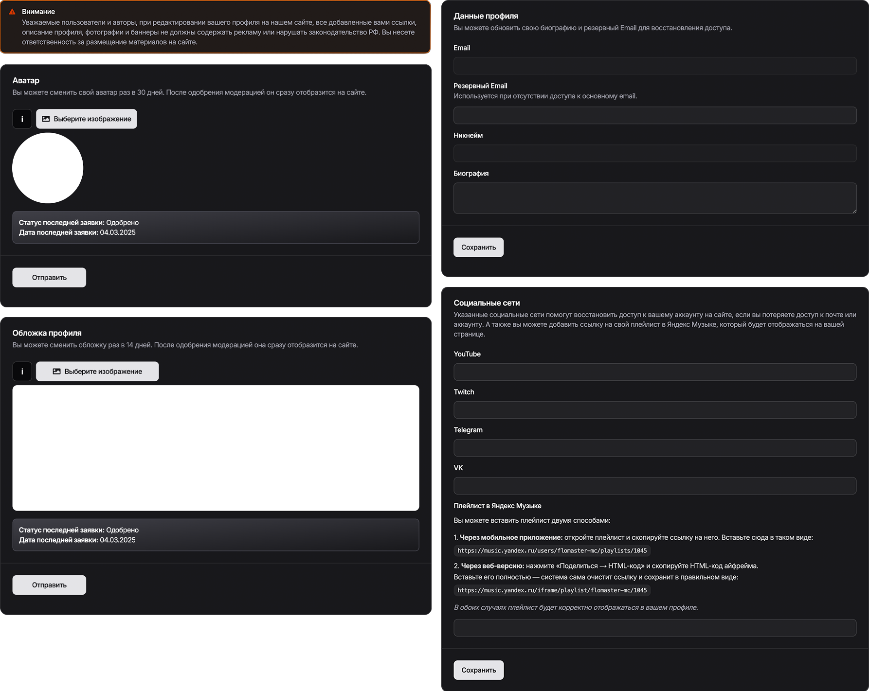 После регистрации на сайте иконка категории в профиле и карточке автора становится синей, автор может изменить аватар и добавить обложку профиля, заполнить описание, добавить резервный адрес электронной почты, прикрепить ссылки на свои социальные сети и плейлист из «Яндекс Музыки»