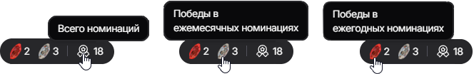 Общее количество номинаций отображается иконкой «Медаль», «Хрустальный рис» — количество побед в ежемесячных номинациях, а «Рубиновый рис» — количество побед в ежегодных номинациях