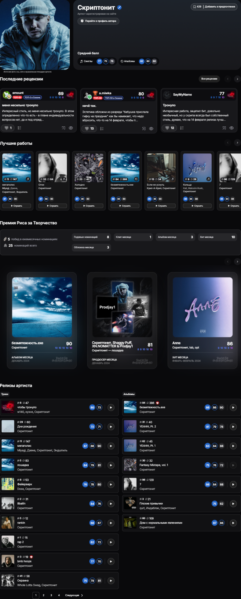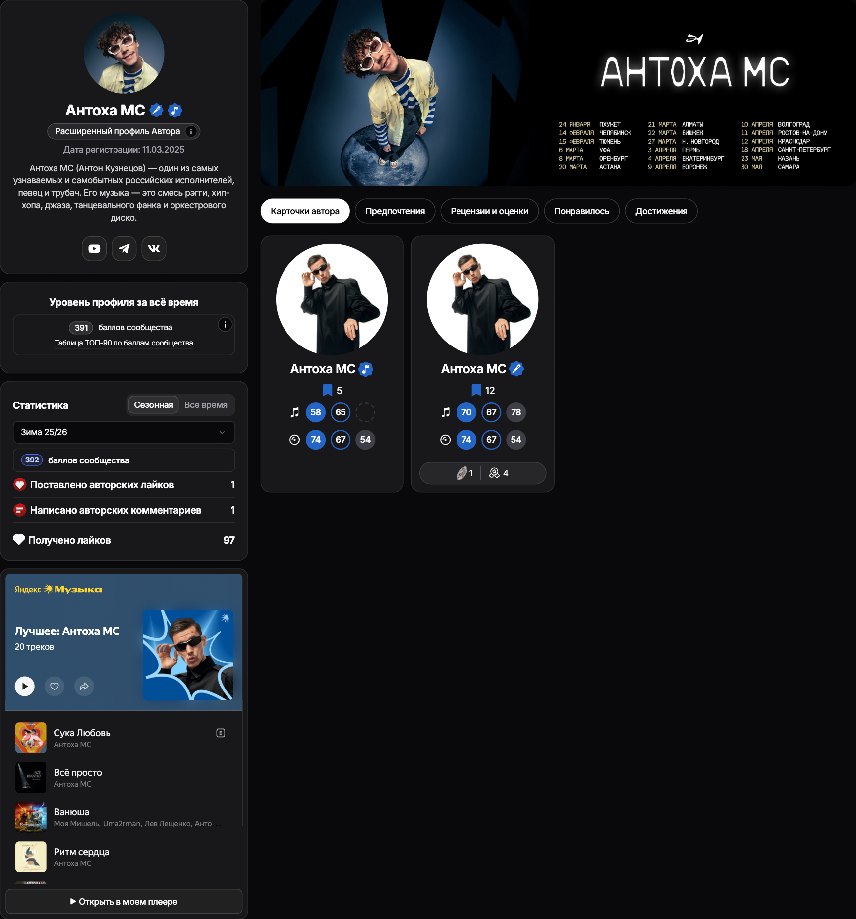 В профиле автора, помимо аватара и шапки, находятся все карточки автора на сайте, дата регистрации, описание, прикреплённые социальные сети, сезонная и общая статистика активности, плейлист из «Яндекс Музыки», пользовательские достижения, предпочтения, рецензии и лайки