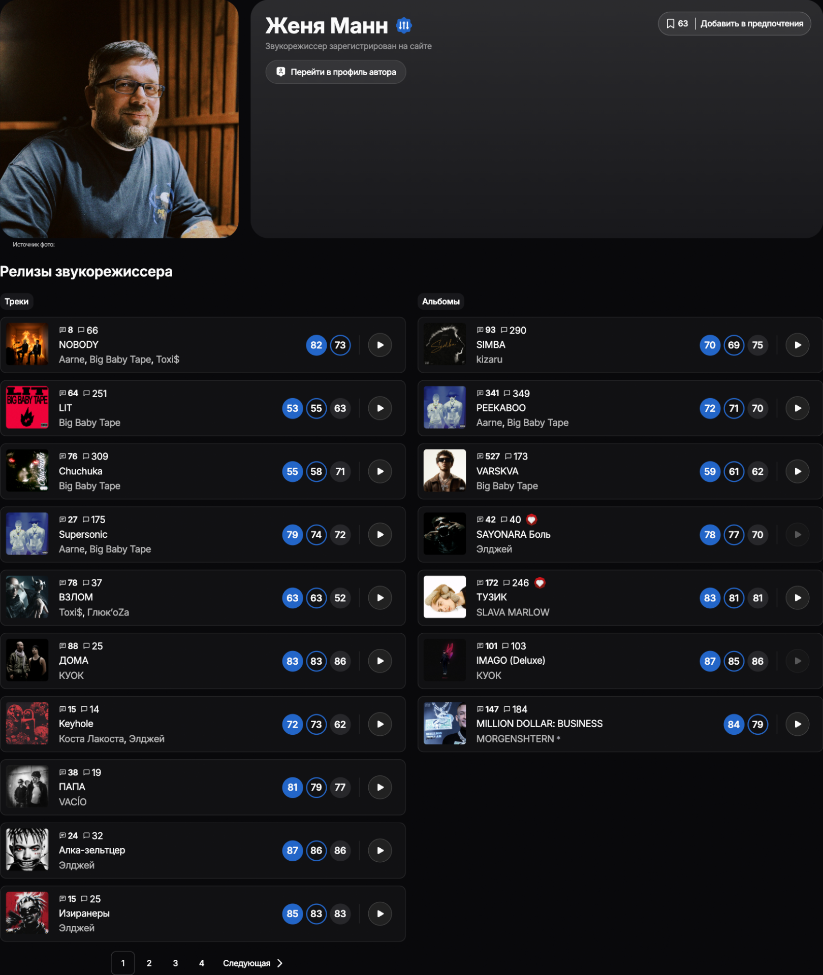 В карточке авторов «Звукорежиссер» указана категория, кнопка перехода в личный профиль автора, количество добавлений в предпочтения и общий список всех работ автора на сайте