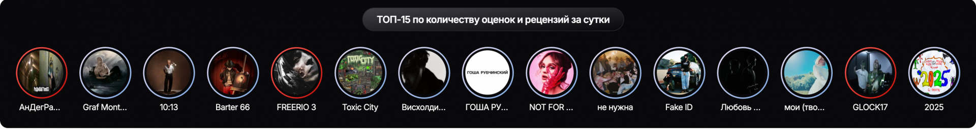 Сторис с релизом в «ТОП-15 по количеству оценок и рецензий за сутки», где автор проявляет активность в виде лайков или комментария, теперь выделяется красной обводкой
