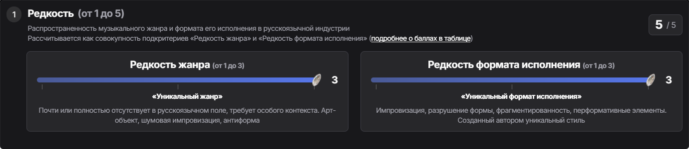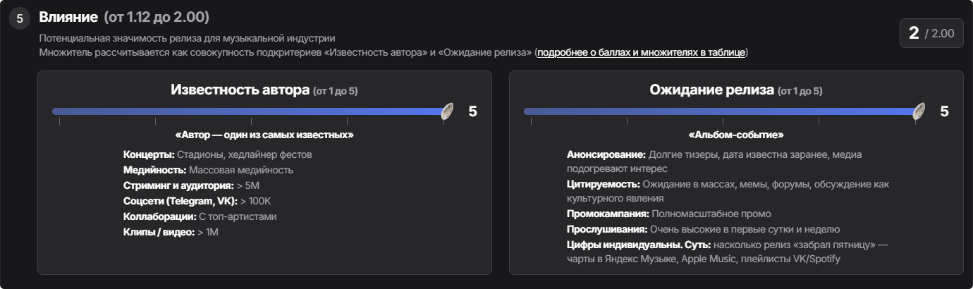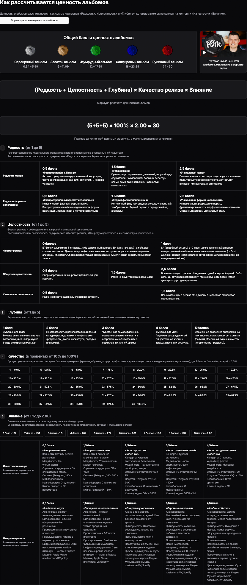 Пояснения к каждому подкритерию отображаются при его выборе в ползунке формы ценности альбомов. Полный список критериев и подкритериев с описаниями в удобном формате можно посмотреть здесь или по кнопке внизу страницы формы присвоения ценности: