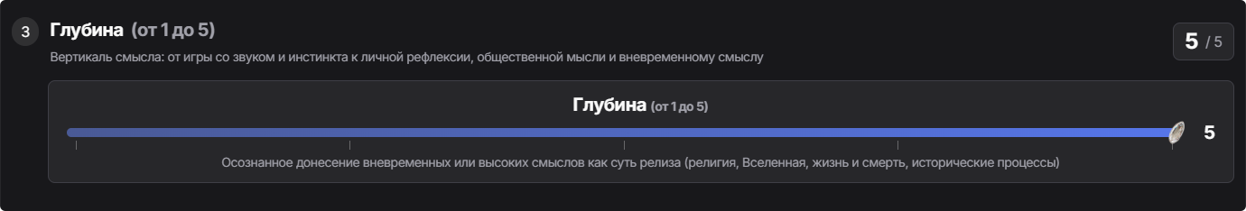 3. Глубина — критерий без изменений — звуковое и инстинктивное наполнение / незамысловатый развлекательный посыл / чувственная саморефлексия о позиционировании личности в обществе / глубокое рассуждение о текущих явлениях социума и общественной жизни / осознанное донесение вневременных смыслов