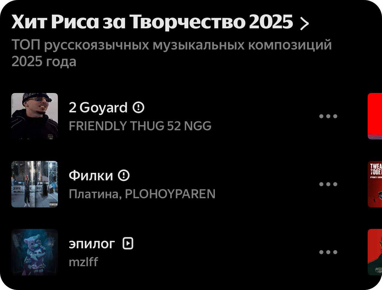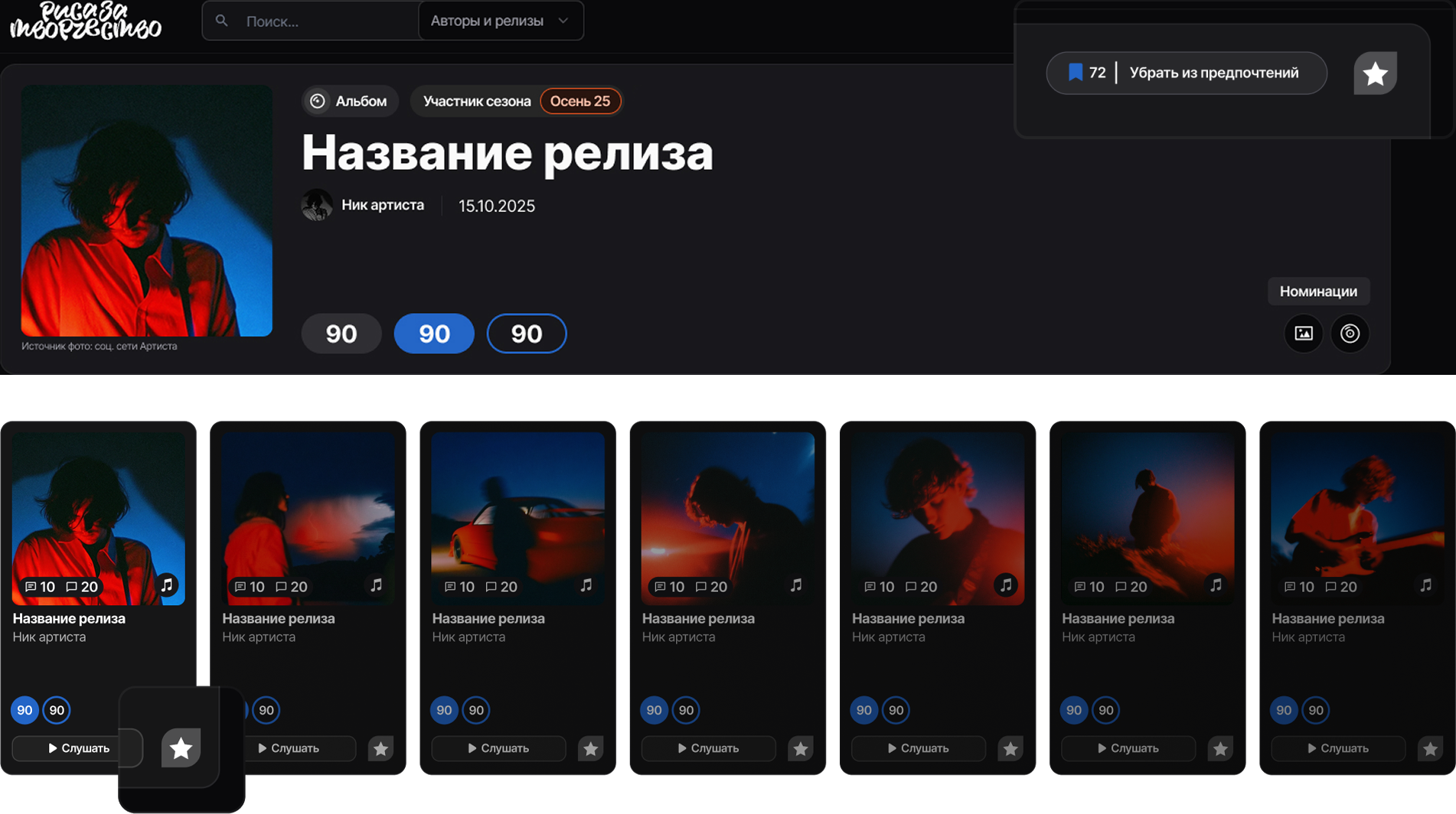 В раздел добавляем ярких начинающих артистов из Премии «Риса за Творчество», «Чарта Нитро», питчинга BandLink, плейлиста «Искра» в «Яндекс Музыке», ивентов и шоукейсов с участием нашего сообщества и со стримов разборов релизов Александра Фломастера
