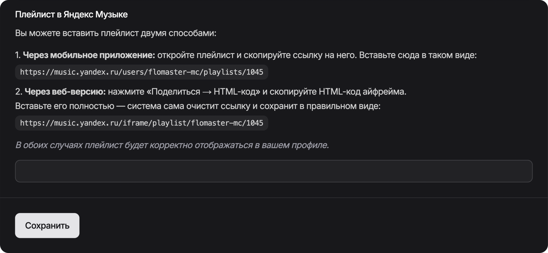Пользователи могут добавлять свой плейлист из «Яндекс Музыки» в личный профиль наравне с «Предпочтениями» для упрощения знакомства с другими пользователями сайта и поиска единомышленников