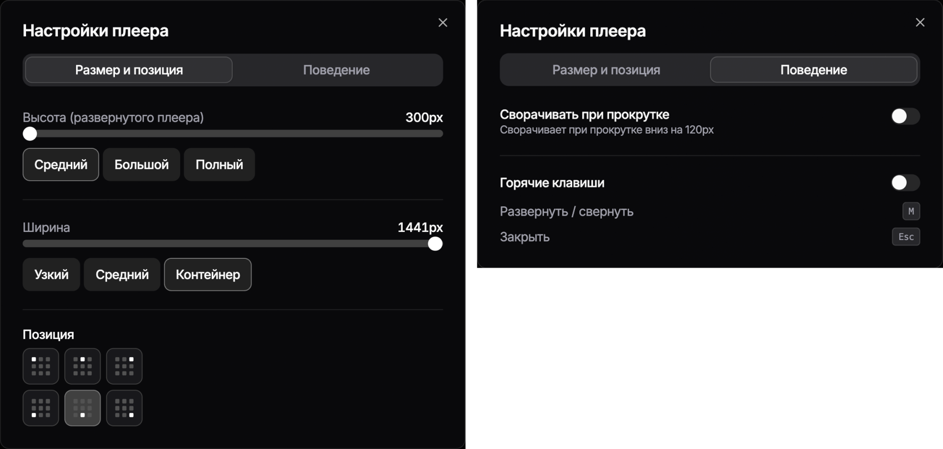 - Добавили возможность настроить свой плеер на сайте (по высоте, ширине, расположению на экране) и дополнительным функциям в виде автоматического сворачивания при прокрутке страницы и горячих клавиш (свернуть/развернуть, закрыть)