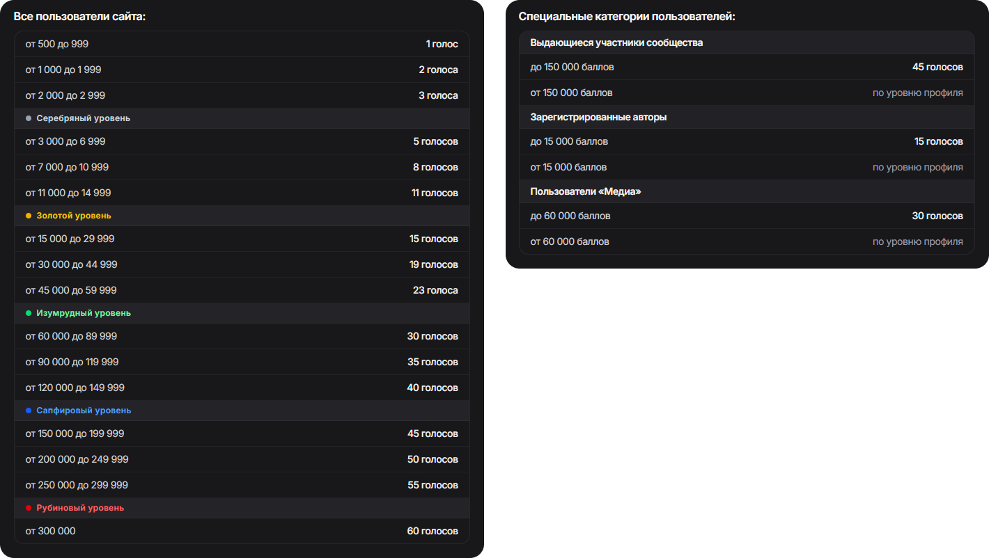 - Пользователи «Медиа»: от 0 до 60 000 баллов — 30 голосов. от 60 000 баллов — количество голосов по уровню профиля